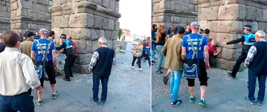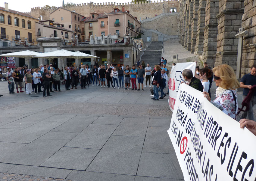 Ambiente crispado por dos factores, por un lado, por el shock de las duras imágenes propiciadas por las cargas policiales en Cataluña, por otro por la presencia de un par o tres de espontáneos, que se encaraban e insultaban a los “pro-catalanes”. “Iros a tomar por culo”, les increpaba un sujeto, insultos respondidos pacificamente con un “contra vuestro odio, nuestra educación”. Lo más grave fue cuando a otro (que paseaba por el Azoguejo acompañado de su mujer e hijo de corta edad) le dio un aire. Los manifestantes formaban un círculo presidido por dos pancartas. El sujeto irrumpió en el círculo a la carrera arrancando una de las pancartas a los convocantes. Salieron a por él y la pancarta una decena de concentrados. Rápidamente un policía local y luego cuatro o cinco nacionales se interpusieron en la barahunda. Aunque rota, la pancarta volvió a su lugar, en tanto la policía apartaba al interfecto y le dejaba suelto por la plaza Oriental. Felizmente la cosa no pasó a mayores.