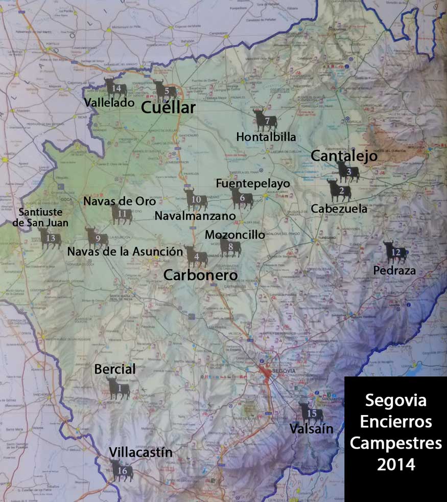En la provincia estos espectáculos pueden disfrutarse en las siguientes localidades: Bercial (julio),Cabezuela (septiembre), Cantalejo (agosto), Carbonero el Mayor (fin de semana inmediatamente posterior al 8 de septiembre), Cuéllar (agosto), Fuentepelayo (agosto), Hontalbilla (agosto), Mozoncillo (agosto), Nava de la Asunción (septiembre), Navalmanzano (agosto), Navas de Oro (julio), Pedraza de la Sierra (septiembre), Santiuste de San Juan Bautista (agosto), Vallelado (septiembre), Valsaín (septiembre)