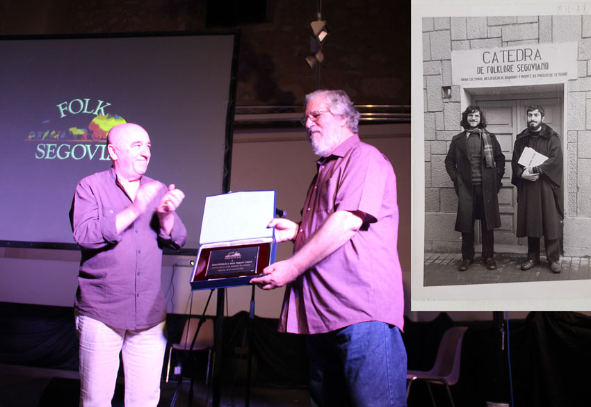 Referencia obligada también del propio festival, en cuya fundación, para que España pudiera acoger el Festival de la Radiodifusión Europea en 1986, tuvo López mucho que ver, como recordó el actual director del festival, Jaime Lafuente, y su antecesor, Luis Ortiz, en artículo publicado en El Adelantado de Segovia. Sobre el escenario de la Alhóndiga, el locutor recordó aquellos tiempos, con locos grupos escandinavos, así como su vinculación con Segovia, que se remonta, claro, a Agapito Marazuela (¿qué parte del folk castellano no se remonta en él?). Con ocasión del homenaje, López colgó en su perfil de FB una foto de 1972 en la que puede vérsele frente a la Cátedra de Folclore Segoviano (es el de la izquierda en el montaje de imágenes posterior). López, con su prodigiosa memoria, hizo las delicias del lleno auditorio.