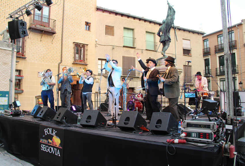 Pero volvamos a Folksegovia, que no ha hecho más que arrancar. Tras el homenaje al padre de Discópolis y el documental, una de las propuestas más desmadradas del festival, los catalanes Biflats, descacharrante mezcla de sardaneros de La Selva, con sus tenoras, flaviols y fliscornios, y el gitanerío balcánico más profundo. Por increíble que pueda parecer suenan tal que la Fanfare Ciocarlia, en tanto sobre el escenario poco tienen que envidiar a los Pogues. Muy divertidos, gamberrismo musical de primera calidad.