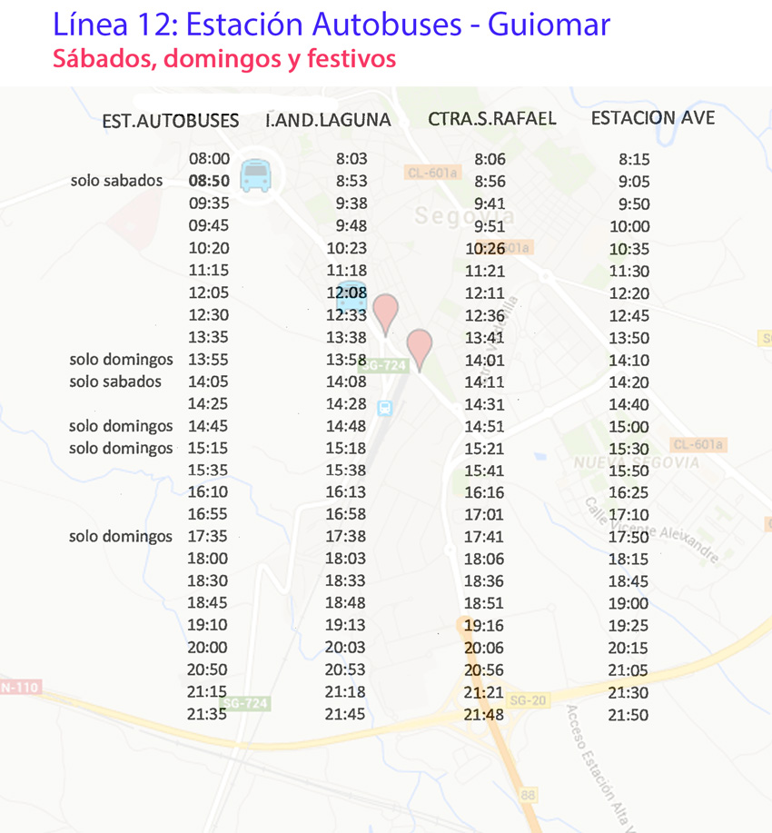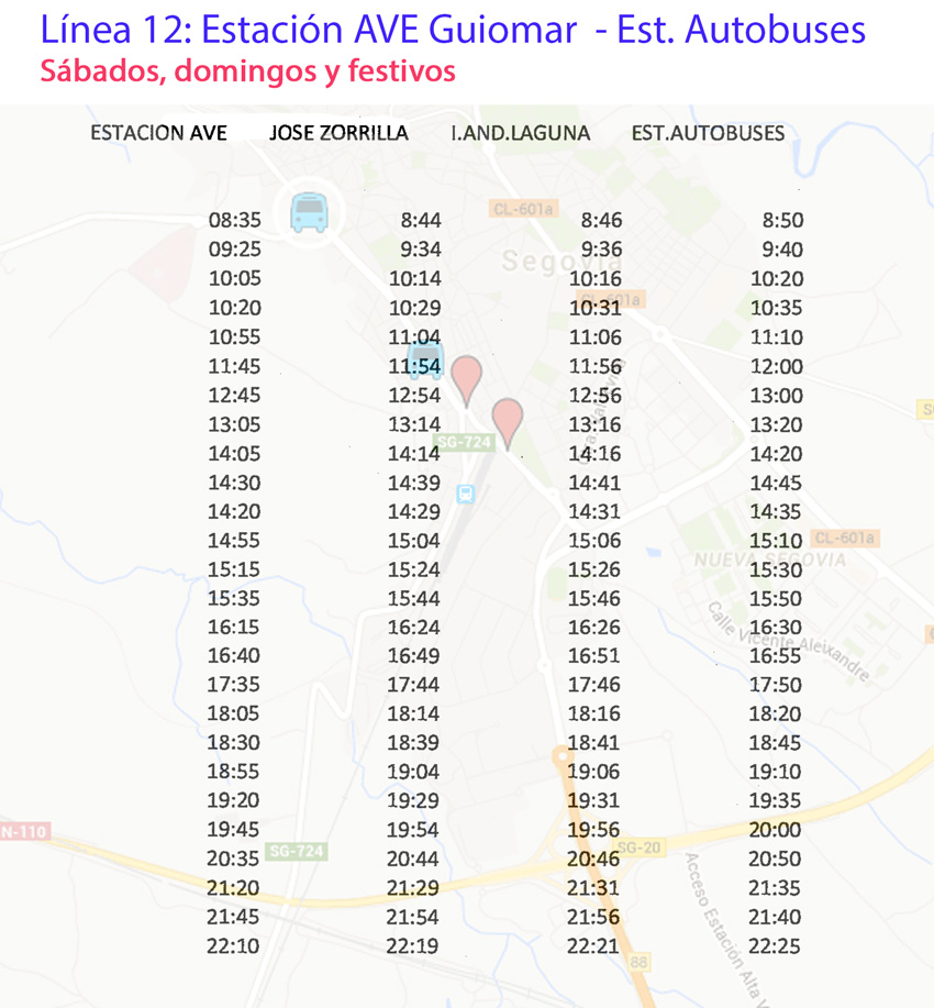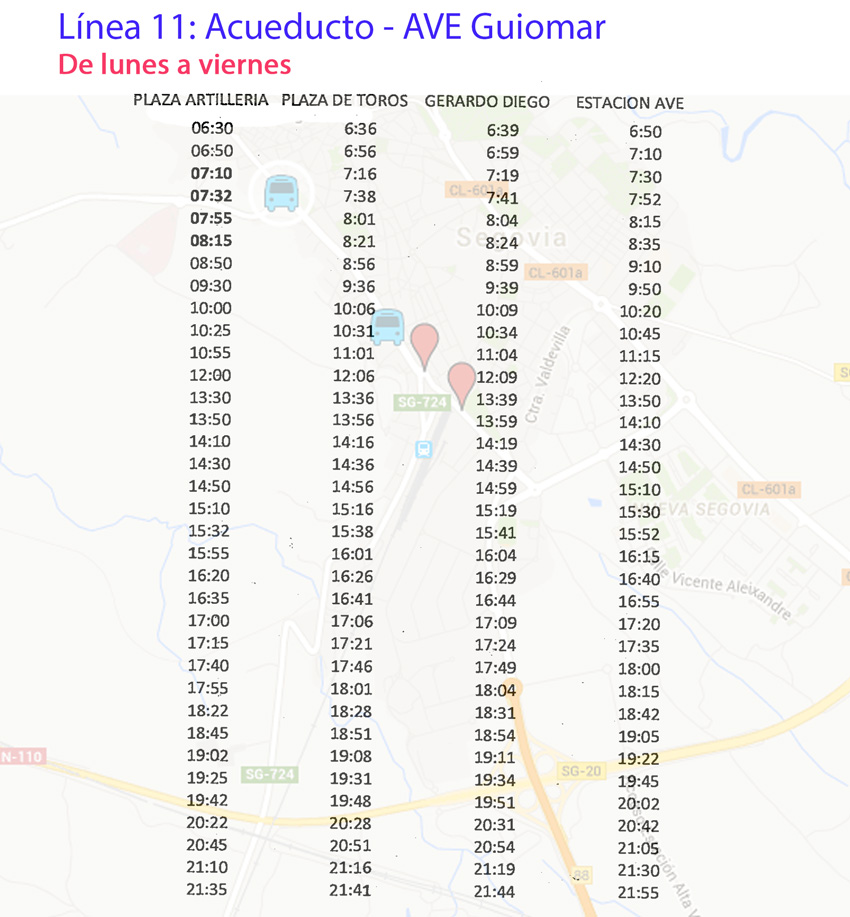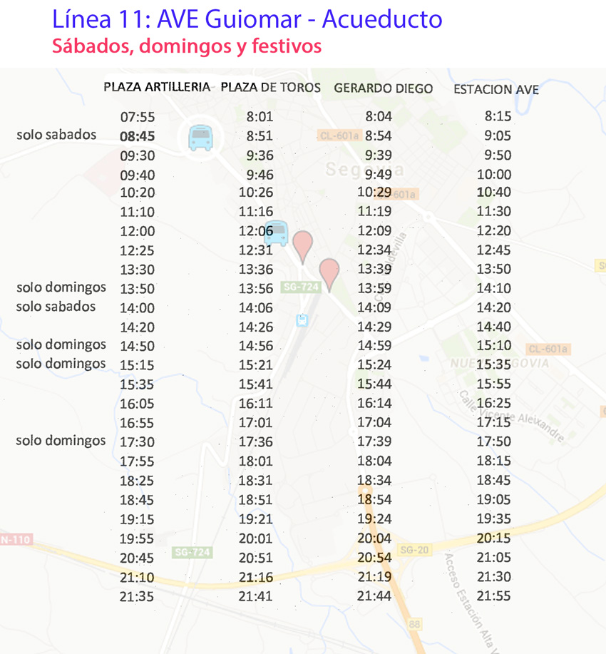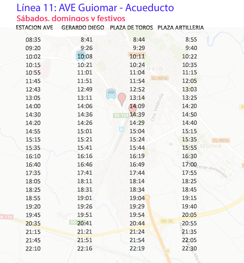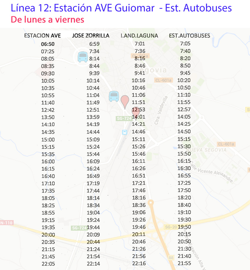 Horarios de autobuses-lanzadera a la Estación AVE Guiomar Segovia. Salidas L11 desde la plaza de Artillería (junto al Acueducto) y L12 desde Estación de Autobuses. (Última actualización, 23 de junio de 2016). Precio billete individual: 2€. Compatible con bonobus, excepto domingo y festivos