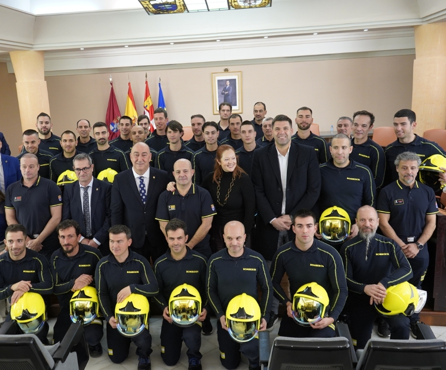 Al finalizar el acto, el presidente de la Diputación invitó a participar en la fotografía de grupo al exjugador internacional de baloncesto Felipe Reyes, que asistió al acto como familiar de uno de los nuevos bomberos.