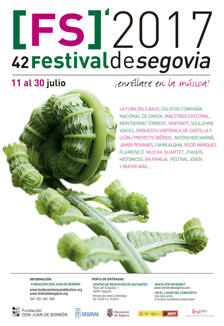 Cuando el verano está llamando a la puerta, el 42 Festival de Segovia, organizado por la Fundación Don Juan de Borbón, con un programa que ofrece desde Gospel a Música Sinfónica, desde Música Coral a Flamenco y, desde Música Fusión a Danza… nos recuerda que es verano está para disfrutar del Arte y de los rincones que ofrece la ciudad. El cartel elegido para este año tiene una fresca y verde imagen, una voluta de un violín, realizada con una rama y el lema de este verano será “Enrollaté en la música”.