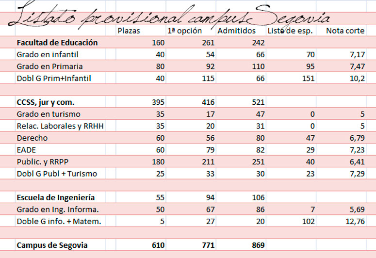 La Universidad de Valladolid daba a conocer el 12 de julio el primer listado provisional de admitidos de los nuevos estudiantes que desean acceder a alguno de los títulos de grado y de doble titulación que oferta la UVa para el próximo curso 2022-2023. Las 610 plazas de primero de las 11 titulaciones que se imparten en Segovia han recibido en primera opción un total de 771 solicitudes. Sin embargo, el número de admitidos aumenta hasta 869 futuros universitarios, pues habitualmente, algunas solicitudes no se concretan durante el periodo de matriculación (hasta el 15 de julio), por lo que habitualmente y en prevención de estas bajas de última hora se genera un “colchón” de admitidos.