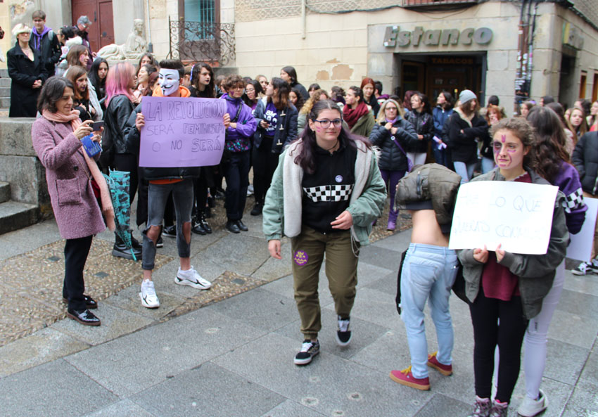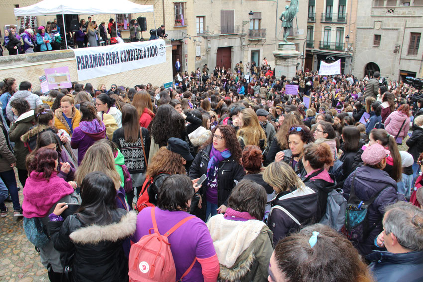 Masiva concentración a las 12 horas en la plaza de San Martín de Segovia en el aperitivo de la manifestación que, a partir de las 19 horas, está prevista salga de la plaza José Zorrilla hasta el Azoguejo. Jornada de huelga, aunque con nulo seguimiento en los puestos de trabajo, públicos y privados, donde en cambio si tuvo notable seguimiento el paro de dos horas auspiciado por los sindicatos mayoritarios. Éxito total de la huelga, en cambio, en los centros de enseñanza, vacíos de mujeres con motivo del Día Internacional de la Mujer Trabajadora.