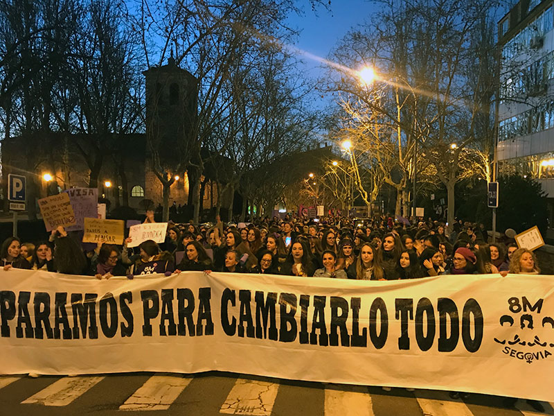 Portando una pancarta con el lema “Paramos para cambiarlo todo” sostenida por mujeres ajenas a cualquier representación política, a la que seguía un grupo de batucada que animaba los lemas que no cesaron de corearse —se oyeron cánticos con letras como “Aquí están las feministas”; “De machos machirulos, estamos hasta el culo”; “Segovia será la tumba del machismo”; “La doble jornada me tiene cansada” o “La calle, la noche, también son nuestras”, entre otros— y detrás, miles de mujeres portando multitud de pancartas caseras y de varios tamaños alusivas a los derechos de la mujer, la repulsa a la violencia machista y a la desigualdad laboral y salarial, o con referencias a situaciones cotidianas de machismo y discriminación