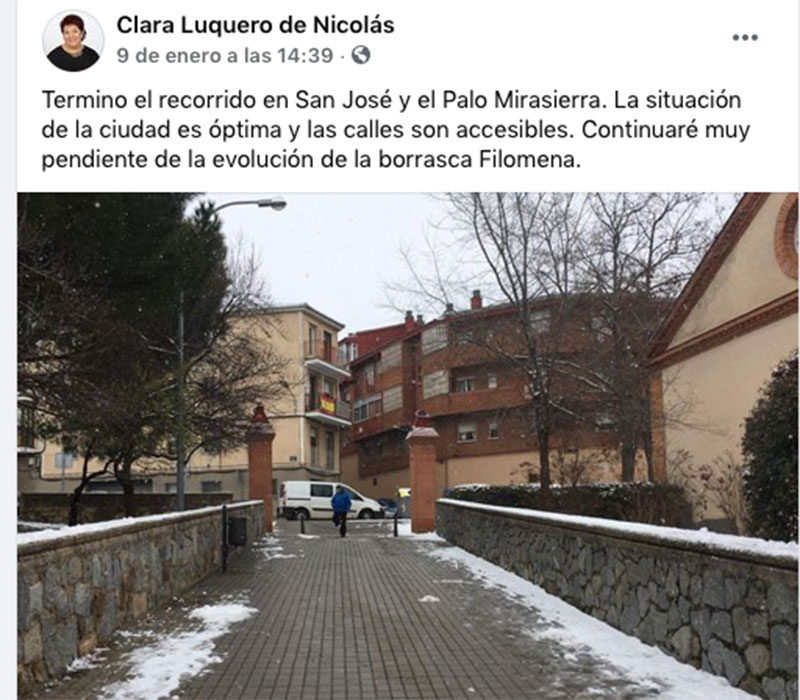 Tampoco recuerdo si el alcalde del momento —debía ser Juan López Miguel— se dio una vuelta por la ciudad una vez que se limpiaron las calles. Aquí si lo hizo, el mismo sábado, la alcaldesa de la ciudad brindando a los segovianos un tour fotográfico para demostrar la eficacia en la limpieza de unas calles en las que no se superaron los cinco centímetros de nieve en los momentos más graves. En 2018 no lo hizo y eso que ya tenía Facebook entonces.
