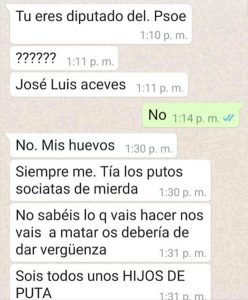 Precisamente, en el muro reproduce una conversación por wattsapp que habría recibido el “compañero” al que hace referencia sin identificarle en el que se hacen referencias como “socialistas de mierda”; “nos vais a matar” o “sois todos unos hijos de puta”