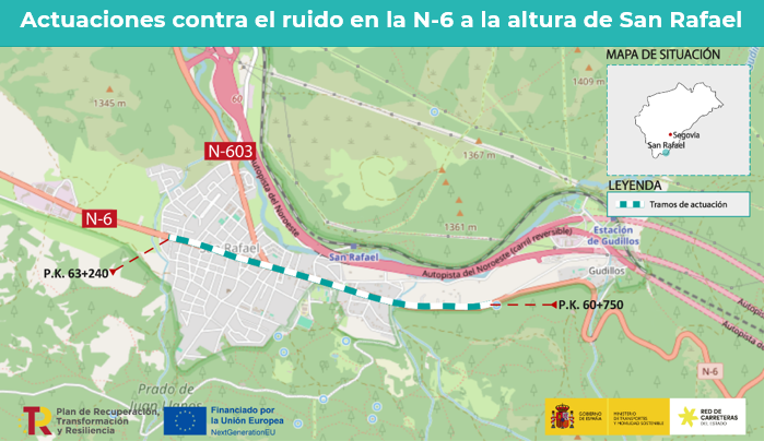 El Ministerio de Transportes y Movilidad Sostenible ha adjudicado un contrato de 571.335 euros (IVA incluido) para ejecutar obras de reducción de ruido en la carretera N-6 a su paso por San Rafael, en la provincia de Segovia. El objetivo es mitigar la contaminación acústica en la zona y mejorar el confort de los vecinos mediante la instalación de un nuevo pavimento fonoabsorbente. Estas obras se enmarcan en el Plan de Acción Contra el Ruido, Fase II.