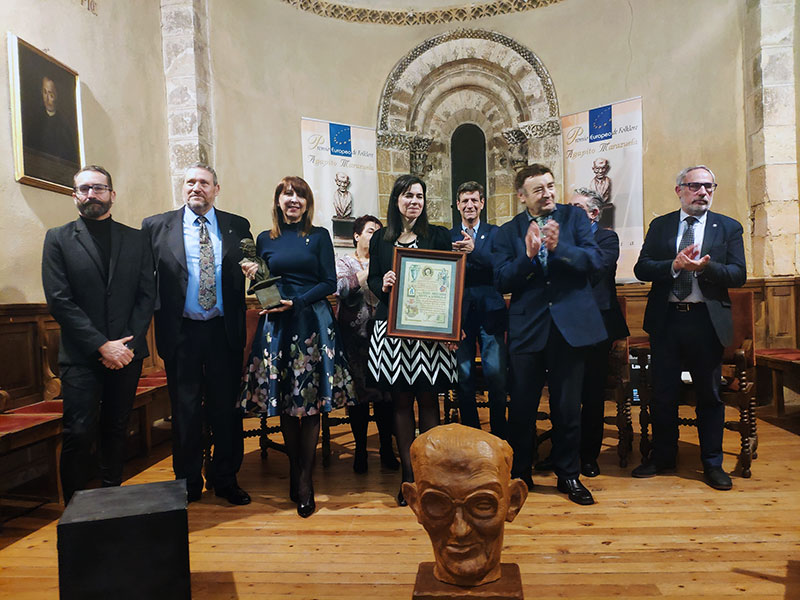 El premio que reproduce el busto de Agapito Marazuela ha sido entregado este 30 de noviembre a los representantes del Museo Ángel Orensaz y Artes del Serrablo, de Sabiñánigo (Huesca) durante un acto celebrado en la sede de la Real Academia de Historia y Arte de San Quirce. La comitiva oscense estaba formada por el propio artista, Ángel Orensanz, la alcaldesa de Sabinánigo y por ello presidenta del Patronato del Museo, Berta Fernández y Begoña Subías, directora del contenedor cultural creado hace cuatro décadas para preservar la memoria de la cultura de unas cincuenta localidades de aquella zona de Aragón.