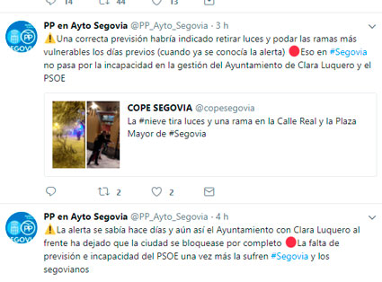 “La alerta se sabía hace días y aún así el Ayuntamiento con Clara Luquero al frente ha dejado que la ciudad se bloquease por completo La falta de previsión e incapacidad del PSOE una vez más la sufren Segovia y los segovianos”, largaban desde el perfil de Twitter del PP en el Ayuntamiento de Segovia. Desdel el PSOE, José Luis Aceves, en Facebook, lamentaba tamaño comentario que tildaba de “populismo barato criticando al Ayuntamiento @segovia_es que es quien trabajará toda la noche y ha reforzado desde hace horas el operativo. Cuanto se nota quién no está a la altura y quien le importa poco la ciudadanía.