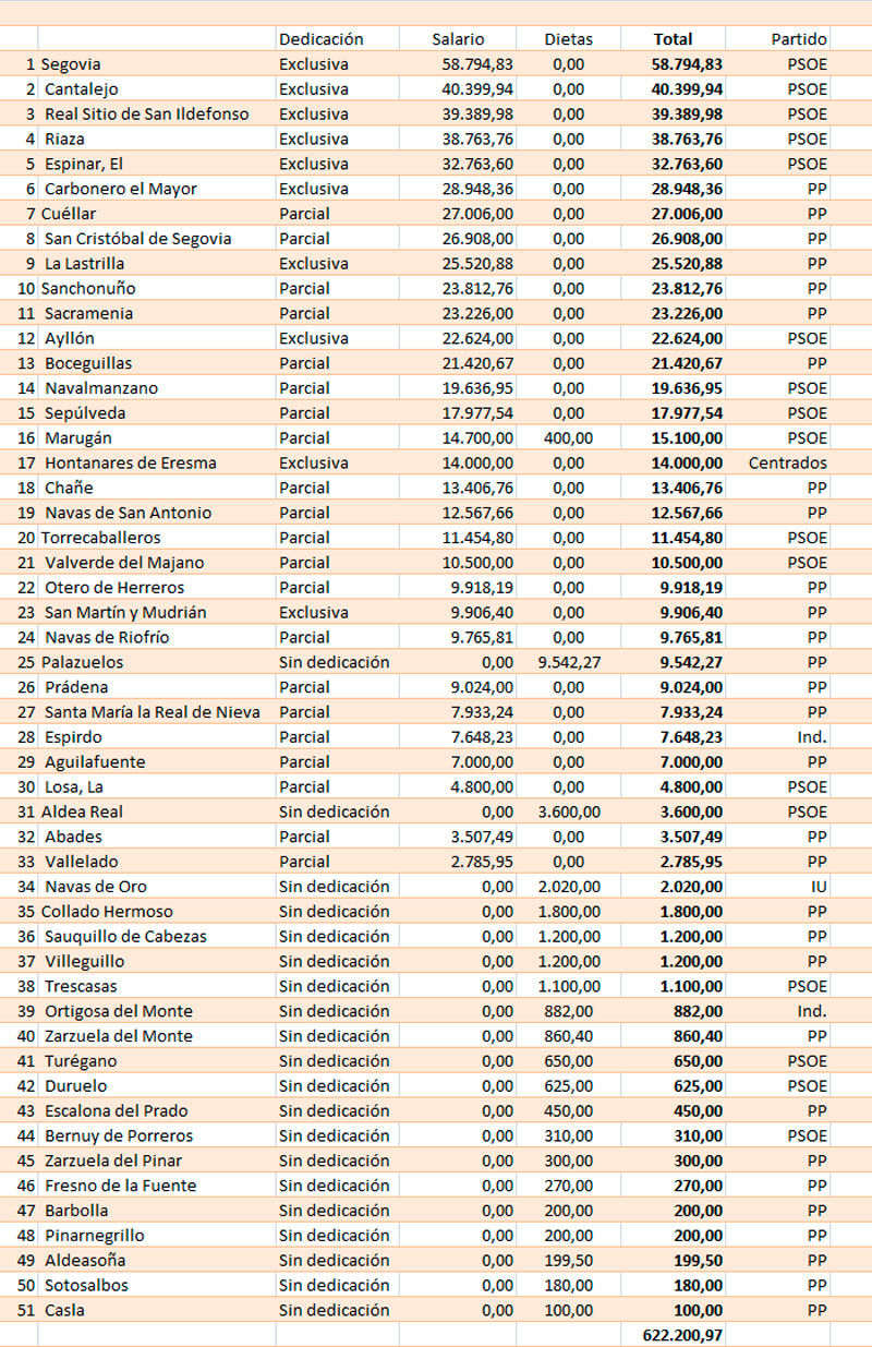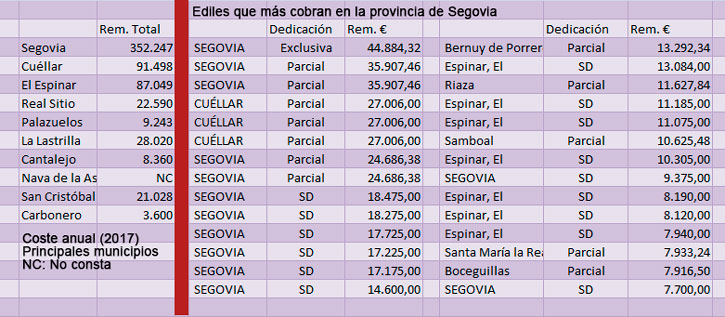 Son alcaldes a tiempo completo, y por orden de ingresos, Clara Luquero (Segovia), Maxi San Macario (Cantalejo), José Luis Vázquez (Real Sitio), Andrea Rico (Riaza), Alicia Palomo (El Espinar). Los alcaldes de la Lastrilla, Hontanares y Ayllón están igualmente liberados. Hay otros 13 con una liberación parcial y el resto cobran por dietas, sin dedicación ni parcial ni exclusiva. Claro que las cantidades son muy diversas, delos 100€ que cobra el alcalde de Casla o los 180 de Sotosalbos (los más baratos), a los 40.399 de Cantalejo o los 58.794 que cobró Luquero en 2017, cantidad dicho sea de paso, que la sitúa en la tabla baja de los alcaldes de capitales españoles, donde la media roza los 70.000€ año.