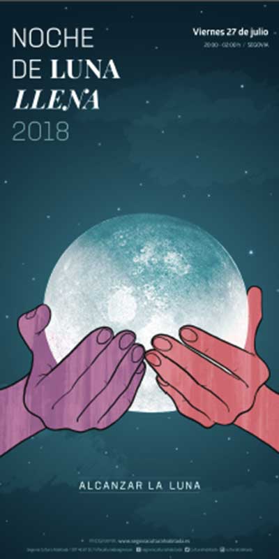 La duodécima edición de la Noche de Luna Llena, velada cultural organizada por la Concejalía de Cultura del Ayuntamiento que se celebrará el 27 de julio entre las 20:00 horas y las 02:00 de la madrugada. En esta ocasión el leit motiv que guía las 42 actividades que componen el programa es “Alcanzar la luna”, en referencia al poder de desarrollo personal y colectivo que proporcionan la cultura y la creación. Música, talleres, espectáculos de calle, gastronomía, literatura, pintura, danza o artes visuales tendrán su lugar en esa Noche repleta de tintes solidarios.