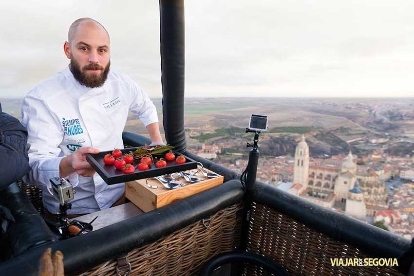 Y es que el inquieto Arnanz, que al frente del equipo del Villena consiguió una estrella Michelín el pasado noviembre, ha confeccionado un menú con productos locales con la idea de reforzar el atractivo de los viajes en globo sirviendo un menú de “la más alta” cocina en plena singladura y que el propio Rubén prepara a quinientos metros de altura y con vistas al Guadarrama y a los techos de Segovia.