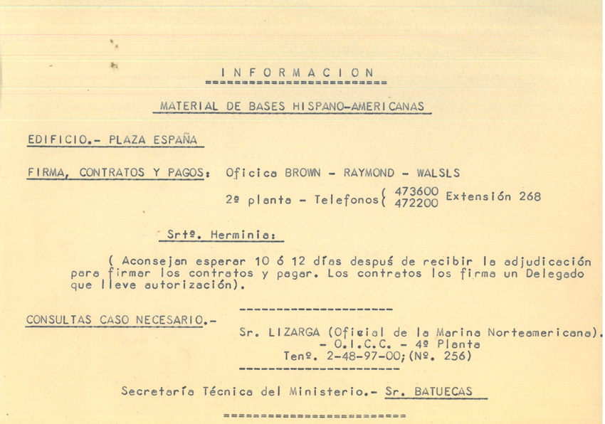 El primero de los expedientes, fechado entre 1959 y 1960, hace referencia a la oferta de numerosos bienes de equipo y herramientas agrícolas que el Ministerio de Agricultura hace al Distrito Forestal de Segovia con carácter gratuito, en virtud del convenio España-USA. El segundo, de los años 1960 y 1961, se refiere a la posibilidad de adquirir, esta vez a precio tasado, material sobrante de la construcción de las bases americanas en España: Rota (Cádiz), Torrejón (Madrid), Madrid, San Pablo (Sevilla), Zaragoza, Morón de la Frontera (Sevilla), Estaca de Vares (Lugo) y El Ferrol (A Coruña).