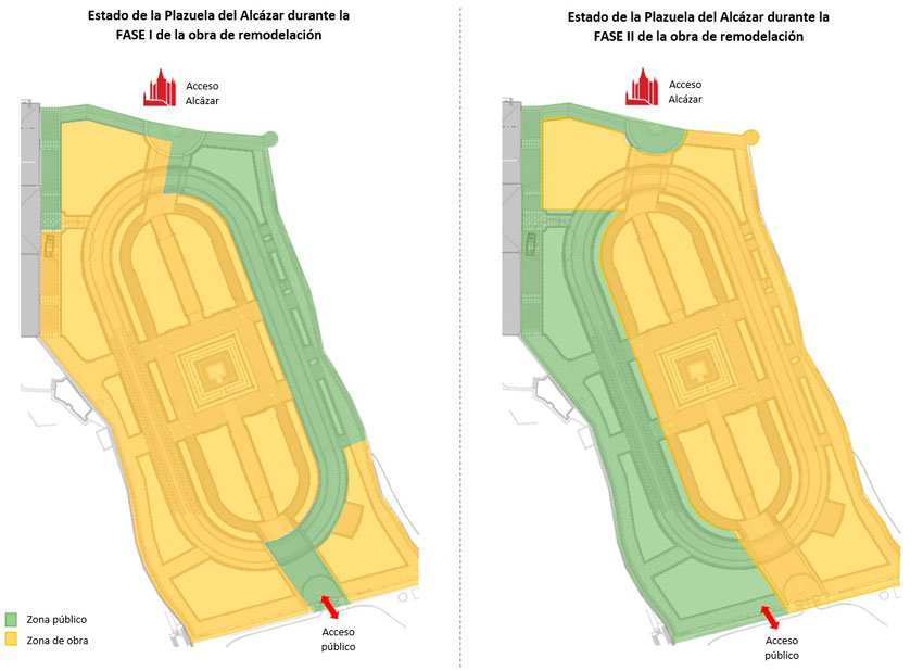 Tras más de un año de obras, el Patronato del Alcázar levantaba el telón sobre la parte de la plaza Reina Victoria Eugenia que hasta la fecha permanecía ocupada por los trabajos. Es la primera fase, que ha mantenido cerrada al público la zona izquierda de la plaza, y que ha tenido como intervención más significativa la renovación de los viales y una restauración aún pendiente de conclusión de la Casa de la Química, “renacida” tras la intervención. A partir del día 26 de febrero empieza la fase II, estando previsto que las obras se trasladen a la parte derecha de la plaza, de modo que el tránsito de visitantes al Alcázar se articulará a través de la zona ahora concluida. La entrada a la plaza se acometerá por un acceso provisional que implica el desmontaje de un tramo de la verja.