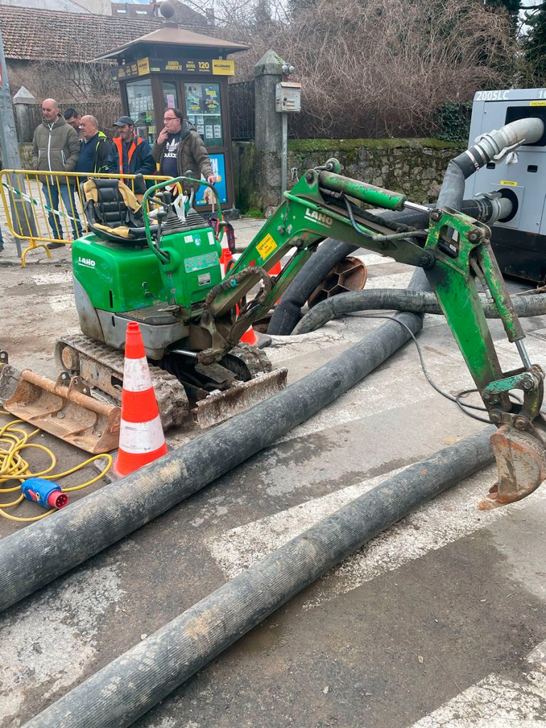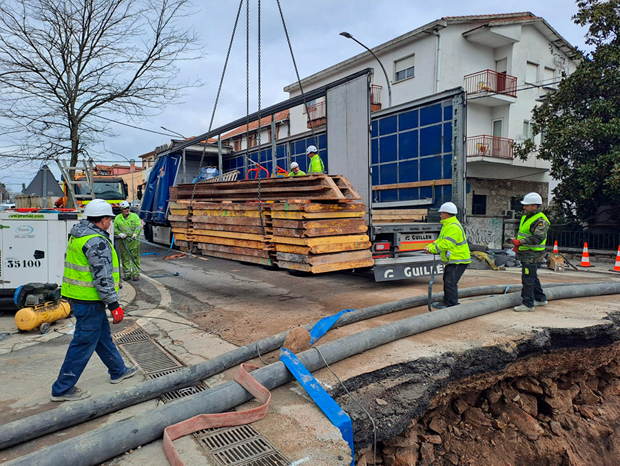 Tras conseguir cerrar la vía de agua y achicar el caudal acumulado, los trabajos se centran ahora en excavar hasta una profundidad de cuatro metros, reparar la base y limpiar los sedimentos de la zanja. Ya se han instalado los sistemas de entibado para garantizar la seguridad del personal y permitir el acceso de la maquinaria necesaria para la extracción de tierras.