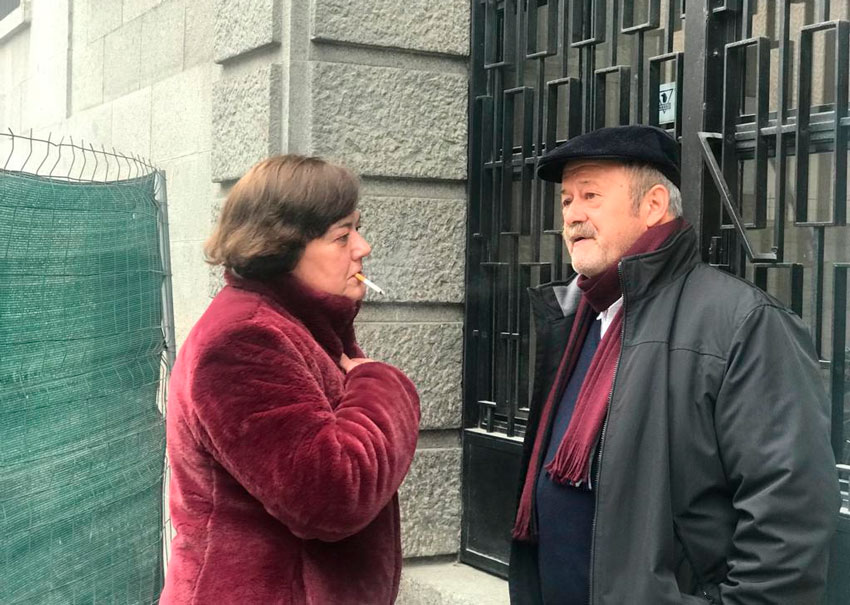 Los primeros en pasar por el trance fueron Antonio Tapias, Enrique Quintanilla y vicepresidente, Manuel Agudiez. Los tres sin detenerse ante la prensa y desafiando el pequeño coro de indignados, encabezado por el perro Bruce y su amo, el ex-empleado de la Caja, Damián Sanz, que desde hace seis años, tres meses y 21 días montan guardia ante la audiencia bajo una pancarta en la que se pide justicia. “No todos los días, pero dos o tres días a la semana sí. Es una vergüenza que esto no esté lleno de gente hoy; han hecho mucho daño a Segovia fastidiando la cultura, el deporte, la obra social”, se queja Sanz. Y sí, lo cierto es que apenas un par de segovianos han venido expresamente a “clamar justicia”.