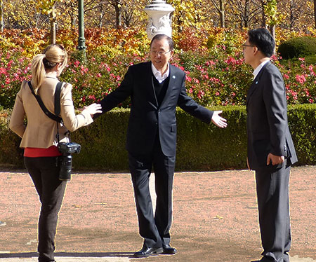 La visita empezó frente a la entrada del palacio de La Granja, donde le aguardaban las autoridades, con el alcalde José Luis Vázquez y la delegada del Gobierno en la región al frente. La cosa no pudo ser peor. Un pequeño retraso que obligó a trastocar el recorrido previsto, lo que permitió a periodistas y escoltas pactar el típico protocolo de “mira, vosotros os ponéis ahí, las autoridades allá, Mr. Ban llega por allá y todos contentos”. Por supuesto nada de preguntas, solo fotos (la prensa coreana apoda a Ban Ki Moon “la anguila”, por su habilidad para esquivar preguntas, eso dice la wikipedia).