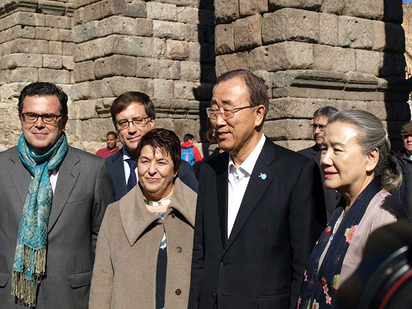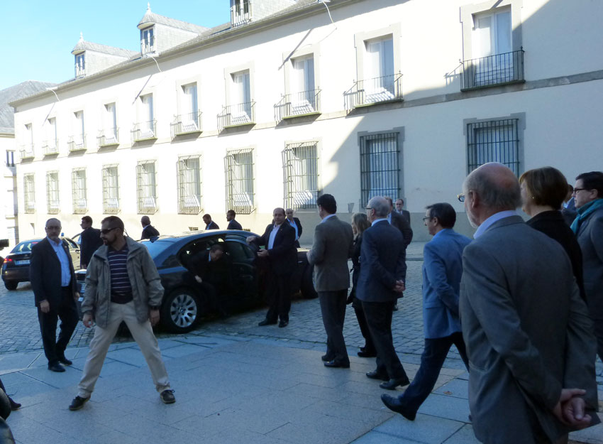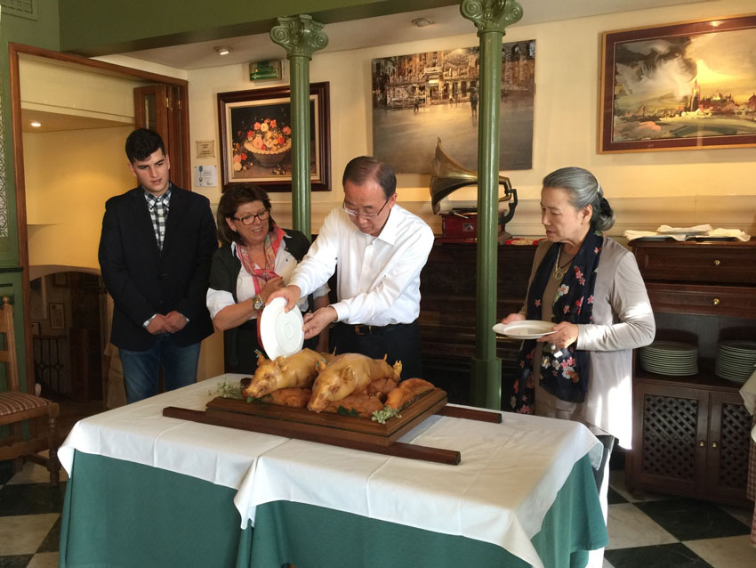 Entre grandes medidas de seguridad, autoridades petardas dispuestos a lo que sea con tal de ser el primero en saludar, y James Bonds de pacotilla, el secretario general de las Naciones Unidas, Ban Ki Moon y su equipo de trabajo (una decena de sus colaboradores más directos) recorrió ayer Segovia. Según explicaban, el diplomático surcoreano conocía Segovia de una visita anterior (en 2006, el Palacio Real de La Granja acogió una Junta de Jefes Ejecutivos de la ONU, presidida entonces por el precedesor de Ban, Koffi Annan). Otra versión, explica que no, que Ban conocía Segovia de un popular programa de la tele coreana, y aprovechando su presencia en Madrid para conmemorar el 60 aniversario de la admisión de España en la ONU, ha querido llevar a su equipo de trabajo a ver el Real Sitio y la capital, con comida tradicional en Duque.