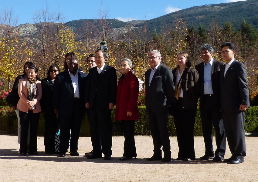 Dejemos el inciso. Los periodistas se fueron a Segovia a ver si había más suerte en la foto del acueducto. Dos o tres nos quedamos por los jardines, camuflados entre los turistas, en tanto el séquito de Ban Ki Moonn sin políticos y durante un buen rato, recorría el palacio. Para nuestra felicidad, y como cualquier otro turista, llegados a la explanada de los jardines Ban y su séquito no pararon de hacerse fotos de grupo, posando ante las fuentes, ante el palació… Y hasta atender alguna que otra pregunta cortés rechazada por el secretario general con suavidad. “Es un viaje estrictamente privado”, informaban una y otra vez los diplomáticos de Exteriores desplazados a la visita.