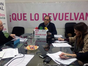 Sarrión, Frías y López (IU) ante la sede de Bankia en una imagen de archivo.