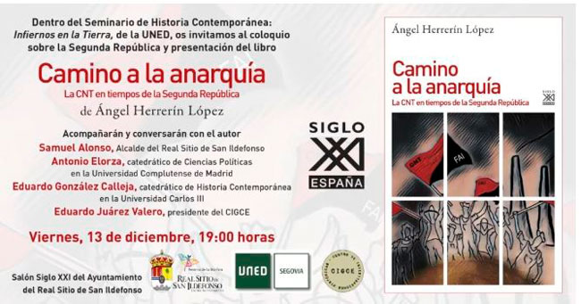 El profesor Ángel Herrerín, Doctor en Historia, y titular en el departamento de Historia Contemporánea de la UNED, presenta el libro Camino a la anarquía. La CNT en tiempos de la Segunda República, hoy viernes a la siete de la tarde en el Ayuntamiento del Real Sitio de San Ildefonso.