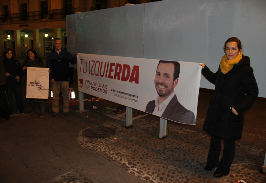 Podemos, tal vez, pero ni unidas ni unidos. IU y Podemos no se mezclan ni para pegar carteles. Los morados montaron su propia pegada en Correos en tanto en candidato al Congreso por Segovia, José Luis Ordóñez, con una decena de compañeros de IU y de Equo, se afanaba en encolar posters de Alberto Garzón pared con pared con los del PP. “Tu izquierda”, reza el lema. Ordóñez apelaba a votar la ¿coalición? para dar un “cambiazo, un cambiazo en lo económico, lo social, lo cultural”.