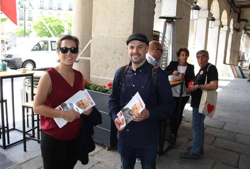 En general no hay problemas con la gente, que es educada y hasta amable. Algo más expuesto es ser de Vox, como Esther Núñez, también de mercado ayer (no en vano es del sector, con heladería de las buenas), repartiendo díptico con propuestas bajo el título “Tu voz en Segovia”. Foto de la candidata para abrir y cerrando con un selfie con Abascal. Dentro, propuestas de limpieza, stop impuestos, “no a los enchufados”, protección de la propiedad privada y protección a ultranza de “el Acueducto, la Ceca, la Semana Santa o los toros”. No constan incidentes.