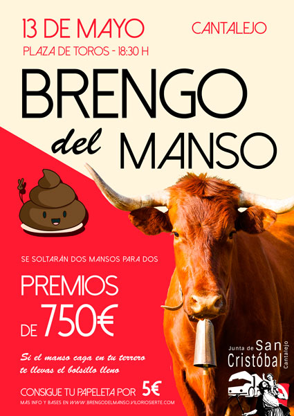 “Si el manso caga en tu terreno, llévate el bolsillo lleno”. Con esta publicidad la junta de la Agrupación San Cristóbal de Cantalejo reedita la popular rifa de la boñiga, consistente en dividir la plaza de toros en parcelas de un metro cuadrado, rifar cada trozo resultante y premiar a aquel apostante en cuya parcela cague el manso. Será el 13 de mayo, a las 18:30 horas, con dos bueyes y 750€ de premio para aquel apostante que consiga que la boñiga caiga en su zona. Es, en briquero El Brengo del Manso. Está previsto sortear 1.500 “parcelas” a 5€ el boleto correspondiente a cada parcela, con tres horas de margen. Un primer sorteo entre las 18:30 y las 20:00 y el segundo de 20:00 a 21:30.