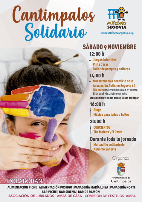 El próximo sábado, 9 de noviembre, desde las 12 de la mañana, Cantimpalos acogerá una jornada solidaria a beneficio de Autismo Segovia; juegos infantiles, pinta caras y talleres, como principio de la fiesta organizada por el ayuntamiento de la localidad. A las dos de la tarde la “gran macarronada solidaria” con un precio de 4 €. Por la tarde a partir de las cuatro, bingo y música para todos, y a las ocho concierto con The Molans y El Posta. Durante todo el día la asociación segoviana tendrá un puesto con información y venta de artesanía. Los tickets de la comida se pueden adquirir en los bares de la localidad y en la tienda Cosas del Hogar. Además, se pone a disposición una fila cero para que cualquiera haga su donación el mismo día o en el nº de cuenta ES45 2038 7654 6560 0005 1985.