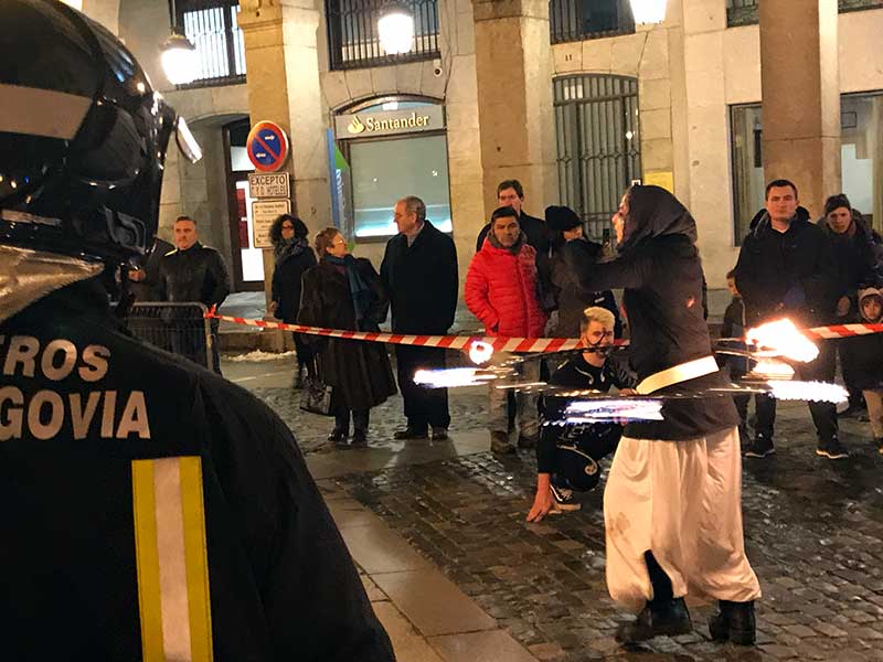 Un bombero vigila de cerca los malabarismos con fuego en el desfile de comparsas.