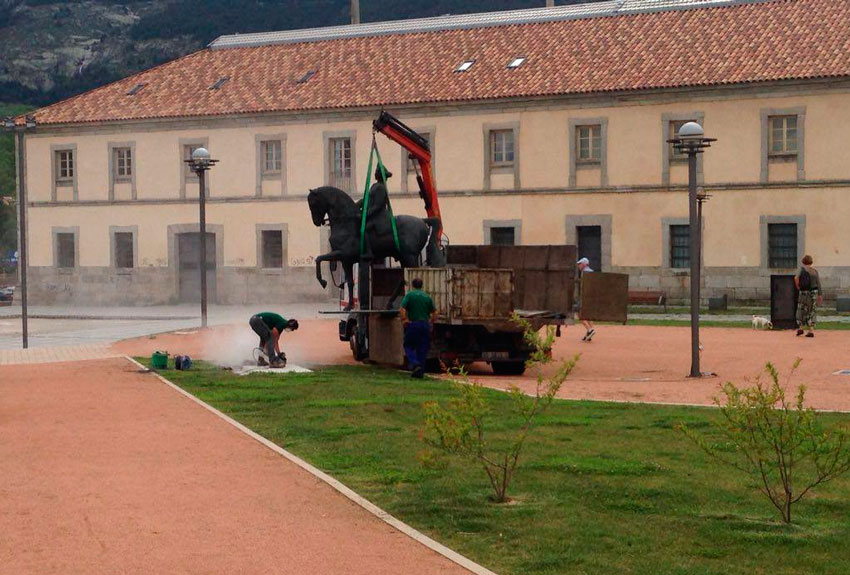 Terminó la larga cabalgata de la estatua ecuestre granjeña de Carlos III. El rey descansa ya en su emplazamiento final, la fachada norte de la Real Fábrica de Cristales de La Granja. Operarios del Real Sitio de San Ildefonso procedieron el 17 de mayo a instalar la estatua lo que casi pone fin a más de una década de idas, venidas y sobresaltos.