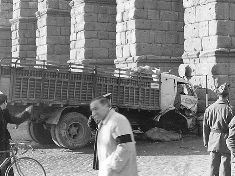 Otros llevan lo de la circulación más a su aire, como ese hombre que se llevó por delante un bolardo de esos gordos que hay delante del Acueducto, una noticia que ha causado gran impacto en la ciudad, casi tanto como aquel camión, Pegaso, claro, que chocó con un pilar cuando las fotos eran en blanco y negro y los coches circulaban bajo el monumento aunque este no encontró el hueco aquella mañana. (La que pongo la tomo prestada de Facebook también, que ya ve que eso es una mina).
