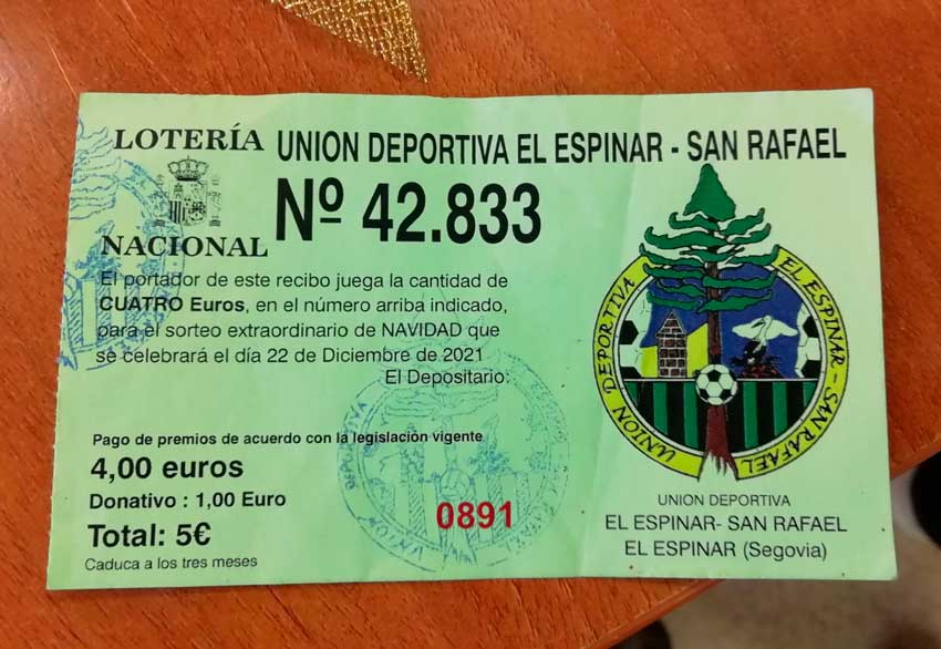 La UD El Espinar-San Rafael iniciaba el 4 de enero la distribución en forma de cheque del dinero correspondiente al número 42.283 de la pasada lotería de Navidad, que agraciado con un cuarto premio ha llenado de millones el municipio segoviano. Distribuido en papeletas de 5€ (un euro para donativo), cada preciado boleto supone por tanto 4€ en juego traducibles en 4.000€ libres de impuestos y el club afirma haber vendido 2.240 boletos, lo que son 8.960.000€ a repartir entre centenares de familias, la gran mayoría del municipio, considerando que no pocas familias llevan dos o tres boletos en tanto que el principal “canal de venta” suelen ser los chavales de la cantera, que raro es el tío, primo, abuelo, que no les compra al menos uno.
