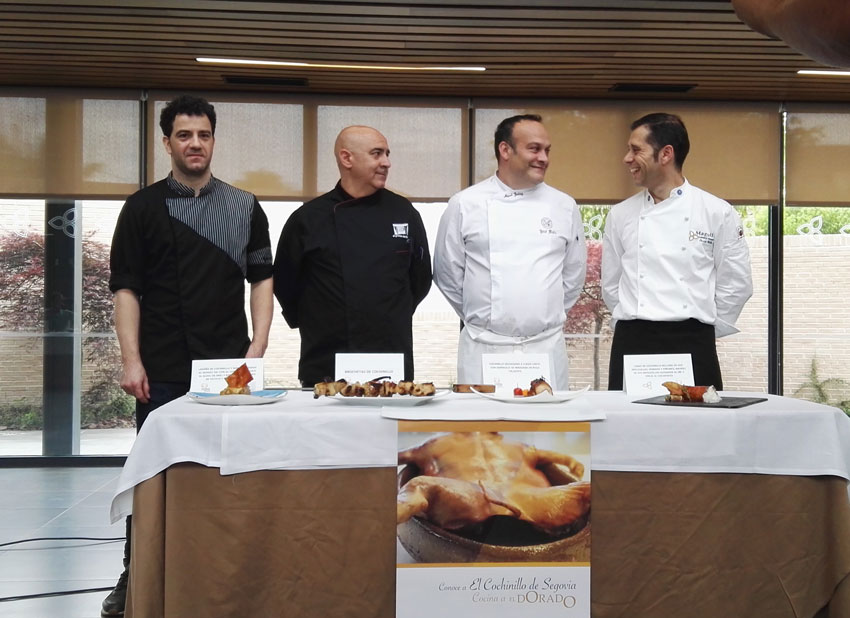 Recetas como lomo de cochinillo relleno de sus mollejillas, hongos y piñones, ravioli de sus menudillos guisados al DYC y oreja al cochifrito (Óscar Calle y anfitrión del Molino de la Venta, donde se ha celebrado la jornada); Lasaña de cochinillo y manzana asada al whisky DYC con su corteza crujiente al alioli de miel y romero, parmentier de patata y trufa de verano  (Ángel Palomo del restaurante Casares Acueducto); Brocheta de cochinillo (Javier González, del restaurante El Portón de Javier de Marugán);  y cochinillo deshuesado a fuego lento con agridulce de manzana en rulo crujiente (Miguel Jiménez del restaurante José María).