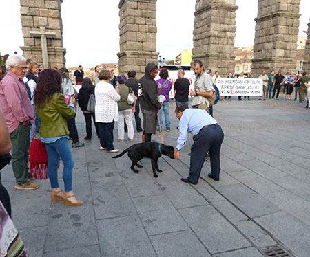 Ambiente crispado por dos factores, por un lado, por el shock de las duras imágenes propiciadas por las cargas policiales en Cataluña, por otro por la presencia de un par o tres de espontáneos, que se encaraban e insultaban a los “pro-catalanes”. “Iros a tomar por culo”, les increpaba un sujeto, insultos respondidos pacificamente con un “contra vuestro odio, nuestra educación”. Lo más grave fue cuando a otro (que paseaba por el Azoguejo acompañado de su mujer e hijo de corta edad) le dio un aire. Los manifestantes formaban un círculo presidido por dos pancartas. El sujeto irrumpió en el círculo a la carrera arrancando una de las pancartas a los convocantes. Salieron a por él y la pancarta una decena de concentrados. Rápidamente un policía local y luego cuatro o cinco nacionales se interpusieron en la barahunda. Aunque rota, la pancarta volvió a su lugar, en tanto la policía apartaba al interfecto y le dejaba suelto por la plaza Oriental. Felizmente la cosa no pasó a mayores.