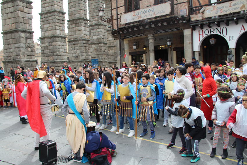Una quedada exitosa. Sobre 1.300 escolares de Segovia, y hasta de Madrid, han participado este año en la propuesta. Al filo del mediodía del 5 de abril, hacia el Azoguejo segoviano confluían grupos de togados, “manipulos” de pequeños legionarios, laureados y césares, para éxtasis de turistas, especialmente chinos, empeñados en fotografiarse posando junto al pintoresco espectáculo.