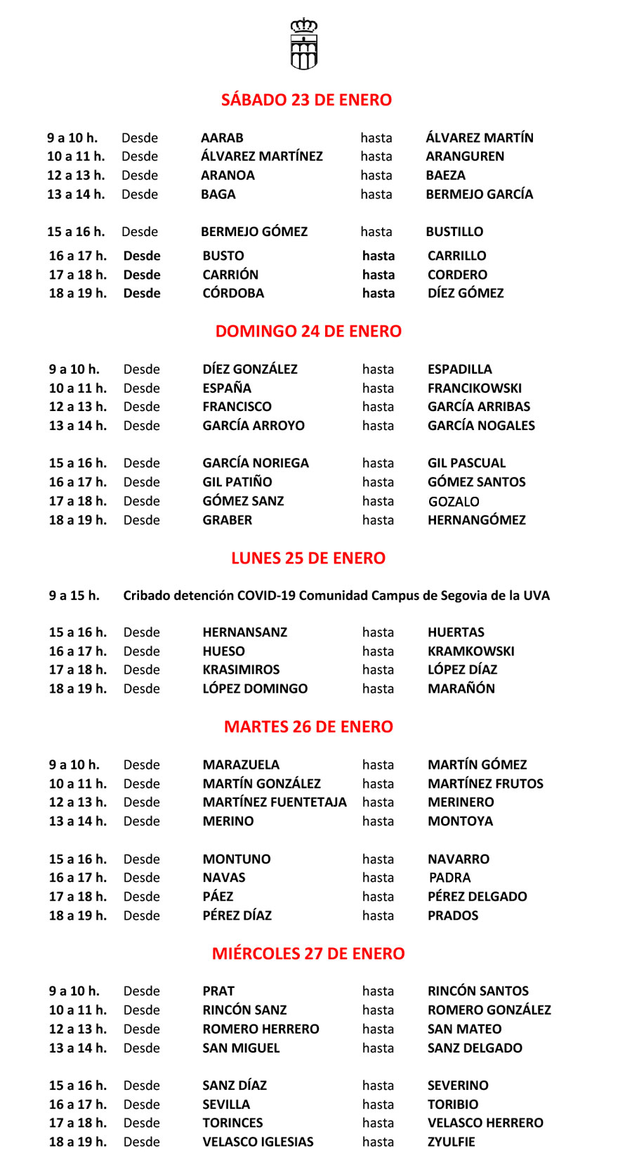 Están llamados a pasar el test de detección de antígenos, por toma de cultivos naseofaringeos exclusivamente los empadronados en Segovia y núcleos agregados (Fuentemilanos, Hontoria, Madrona, Perogordo, Torredondo, Zamarramala y Hontoria), mayores de 12 años, que no estén en situación de aislamiento por covid y que no hayan pasado la infección en los últimos tres meses. Para la elaboración del listado no se ha considerado la preposición “de” entre nombre y apellido, así, por poner un ejemplo, Juan de Miguel debería ajustarse a la franja horaria de 13 a 14 horas del martes 26 de enero.