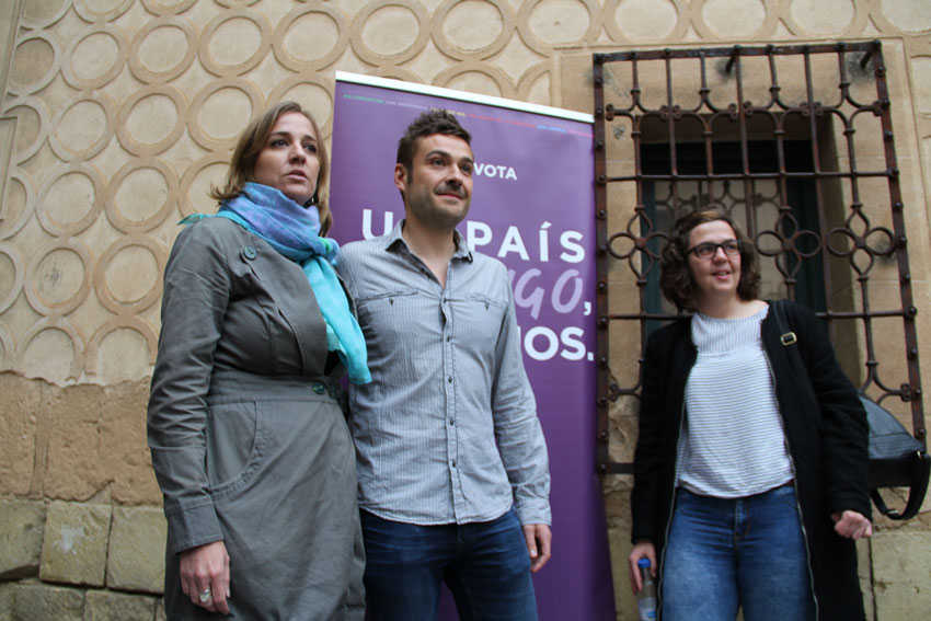 Fue durante la laaaarga espera, 40 minutos, a que sometió a militantes y periodistas la “estrella” del acto inaugural de la campaña, Tania Sánchez. La diputada, que tenía mitin en San Quirce, fue bastante parca ante los medios, destacando su “satisfacción” por la buena marcha del proceso de confluencia, de la que siempre ha sido una valedora ya en tiempos de su militancia en IU, cuando formaba pareja sentimental con Pablo Iglesias. Para Sánchez, la repetición de las elecciones servirá “para desbloquear un gobierno de cambio” achacando los cuatro meses de conversaciones infructuosas al “error de no clarificar de entrada qué formas de gobierno se quieren”. En la imagen, Sánchez y López Vela junto con la procurador de Podemos, Natalia del Barrio.