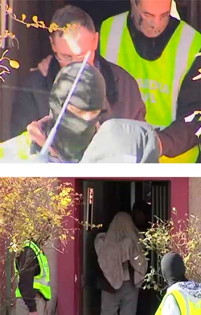 Fue un registro largo, de cuatro horas, a pesar de que el sospechoso solo ocupaba una habitación de un piso compartido con dos trabajadores inmigrantes. En su cuarto se encontraron vídeos propagandísticos del DAESH, algunos escabrosos con decapitaciones y ejecuciones, así como documentos de islamismo radical. Nada de armas. El operativo se desplazó entonces a Valsaín, al número 30 de la carretera de Villalba, donde reside Tomás Cerezo, el segundo detenido en la operación, y bien conocido en la zona por pertenecer a una familia de 10 hermanos y de quien constan antecedentes penales y pequeñas penas de prisión. La Guardia Civil buscaba armas, explosivos y drogas. Igualmente registraron un vehículo Mercedes, vinculado a Cerezo. Dos horas después salían tanto Fernández Aceña como Cerezo, este con la cara cubierta, esposados y custodiados por la Guardia Civil. Partiendo en dos coches distintos hacia la Audiencia Nacional, a prestar declaración ante la jueza.