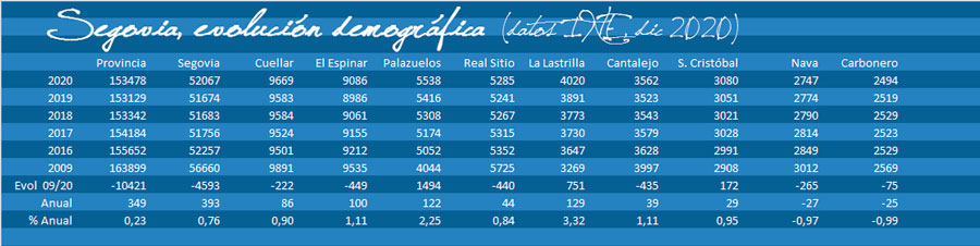 Cómo se ve, Segovia y su alfoz, así como Cuéllar y El Espinar, sustentan este aumento demográfico, en detrimento de la Segovia rural, que sigue en la tónica de la despoblación. De entre las diez mayores localidades, son precisamente las de carácter más rural, Nava de la Asunción y Carbonero las únicas que pierden población. En Perosillo, el pueblo más pequeño, pasan de 16 a 15, de 19 a 16 en Ventosilla y Tejadilla.