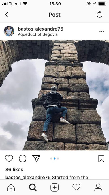 El nota se hace llamar bastos_alexandre75 y todo indica que se trata de un chaval muy joven, extranjero, que recientemente ha estado de excursión por Segovia. Es también un claro candidato a “tonto del mes”. Hace dos día colgaba en su cuenta de Instagram un serie de tres fotografías trepando por los sillares acueducto arriba en el tramo central del Azoguejo y en la que se le puede ver llegando hasta la segunda cornisa (a unos cinco metros de altura).