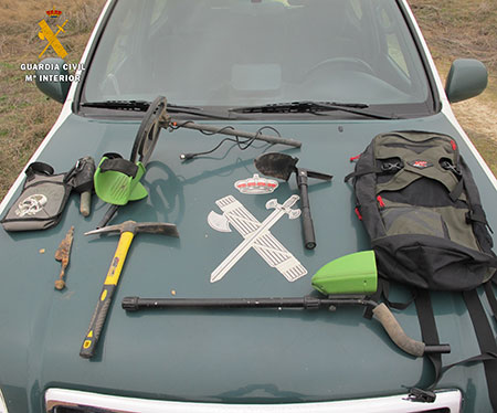 La primera operación llevada a cabo por agentes del Seprona se desarrolló en una fecha que las fuentes oficiales no concretan, en el término municipal de Torrecaballeros, donde se detectó a una persona que llevaba una mochila de la que sobresalía un detector de metales. En su interior, encontraron una pala desmontable y objetos para remover el terreno, además de dos monedas y “cuatro piezas metálicas sin determinar”.