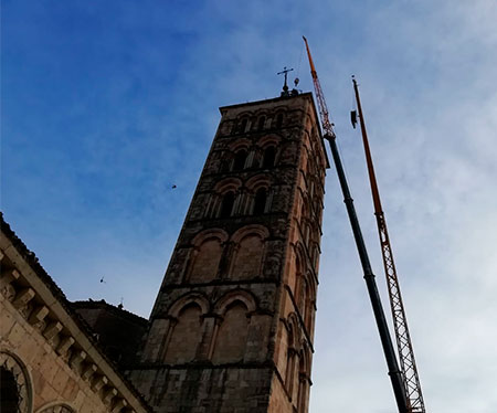 Operarios especializados en trabajos en altura contratados por el Obispado de Segovia iniciaron en la mañana del 23 de diciembre la operación de desmontaje y descenso del “gallo de San Esteban”, enorme veleta de más de tres metros de altura y varios cientos de kilos, hierro macizo, que a consecuencia de los vendavales de los últimos días quedó vencida y en inminente riesgo de desprendimiento.