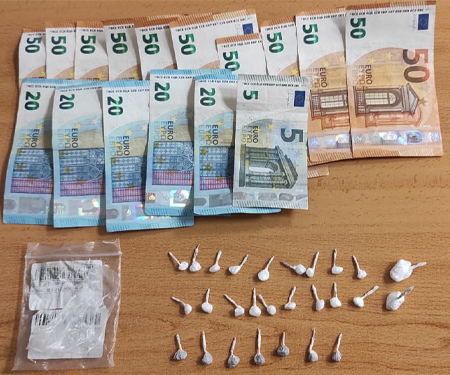 El pasado día 17 de marzo, durante un dispositivo operativo de seguridad ciudadana, enfocado a la prevención de hechos delictivos como el tráfico minorista o el consumo de drogas, se paró un turismo. Una vez informado el conductor del motivo de la parada, se procedió a comprobar su documentación y la del vehículo, y se observó una actitud de inquietud en el hombre, motivo por el que se realizó un registro superficial del vehículo, de la persona y de sus pertenencias. Se hallaron entonces bajo la vestimenta, una bolsa en cuyo interior había 20 envoltorios de cocaína y siete de heroína. Se encontraron también en su cartera 605 euros en billetes de diferente valor.
