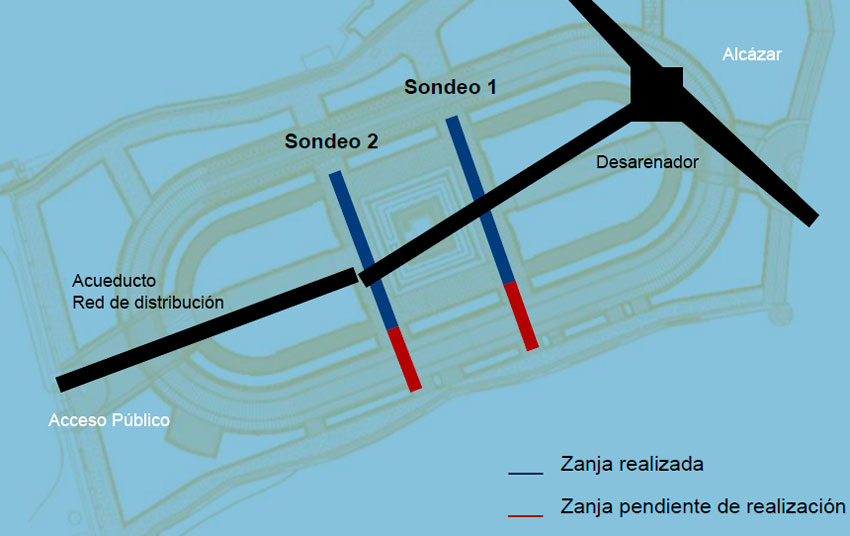 Un importante hallazgo arqueológico ha sido precisamente el desarenador en buen estado de conservación, que decantaba el agua del acueducto y lo repartía tanto hacia el Alcázar, continuando el ramal principal del acueducto, como hacia el aljibe que se ubica junto a la entrada de la Casa de la Química, por una canalización secundaria. Dado el interés que presenta el desarenador se ha modificado el diseño proyectado para que esta estructura hidráulica quede accesible en el subsuelo de la plaza, bajo unas grandes compuertas, y poder ser estudiado en el futuro.