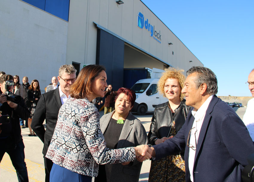 La Ministra de Industria, Comercio y Turismo, Reyes Maroto, acompañada de la alcaldesa de Segovia, Clara Luquero y del responsable de la Empresa Nacional de Innovación, ENISA, José Bayón, visitaron la fábrica de derivados de celulosa de Drylock, en Segovia acompañadas por el fundador de la empresa, Bart van Malderen, y su director general en España, Miguel Ángel González.