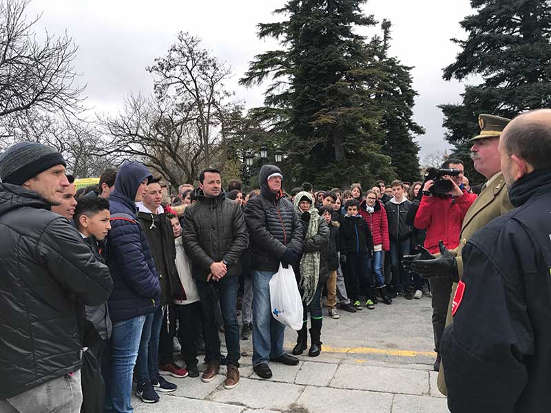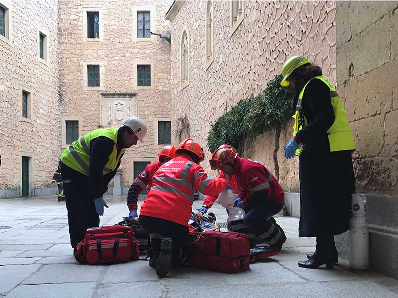 La aplicación del protocolo genera una respuesta inmediata. Unos cinco minutos después de la llamada aparecen los vehículos de emergencias con bomberos y sanitarios mientras el personal y los visitantes —colaboraron con gran interés varios grupos de estudiantes de instituto pero también turistas “de verdad” previamente avisados— eran evacuados por la puerta principal, algunos y el resto a través del paso a través del pasadizo de la Coracha de la torre Barragana creado en 2010 precisamente por recomendación de los bomberos y de ahí a la plaza de la Reina Victoria Eugenia por el camino del puente del Piojo.