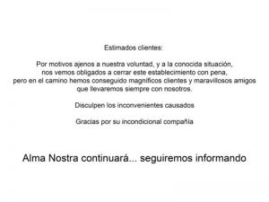 Seis semanas después de iniciada la asfixiante presión en una situación que los empresarios consideran “de acoso”, Alma Nostra echaba el cierre este 26 de septiembre. En sus persianas un mensaje: “Estimados clientes: Por motivos ajenos a nuestra voluntad y a la conocida situación nos vemos obligados a cerrar este establecimiento con pena, pero en el camino hemos conseguido magníficos clientes y maravillosos amigosque llevaremos siempre con nosotros. Disculpen los inconvenientes causados. Gracias por su incondicional compañía. Alma Nostra continuará… Seguiremos informando”.